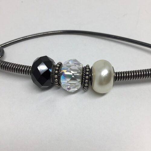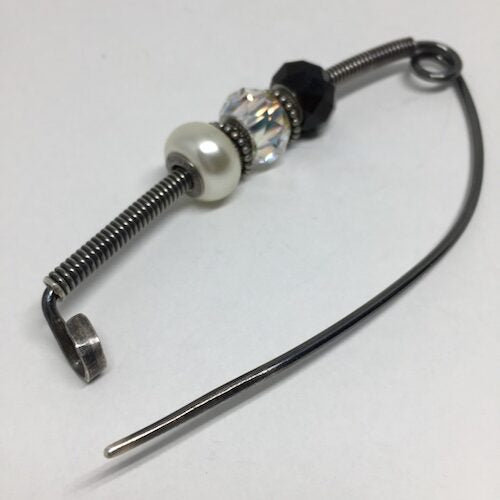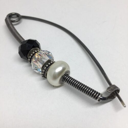 Completely hand wrought by Lisa in her Toronto Studio. Made from oxidized sterling silver and an assortment of three colours of crystal and/or pearl Swarovski beads. Each one is carefully handmade one at a time, and therefore uniquely beaded. The image above is the exact Beaded Safety Pin you will receive. This pin is beaded (left to right in close up of bead image) Swarovski Jet BeCharmed crystal bead, Bali sterling spacer bead, AB BeCharmed crystal bead & ,Bali sterling spacer bead, Cream coloured BeCharmed pearl bead. Each pin is approximately 4.0″ in length, 1.5″ wide, and any of the Swarovski crystals or pearls are about 1/2” in diameter. Pin weighs 25.0 grams, which is much lighter than the all precious metal Coiled Safety Pin, so can be used with lighter weight, large yarn projects.