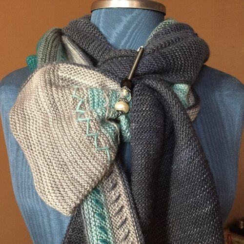 Oxidized sterling silver and Swarovski crystal. Large size, safety pin style closure for all your larger knits. For use with large shawls, wraps, scarves and cardigans. Wearer can either “pierce” the knitted fabric in between the stitches, or gather the knitted fabric (i.e. for a shawl, wrap or scarf) in between the safety pin “arms, and clip the pin closed so it surrounds all the material without piercing it (as shown on scarf above). This large size is good for any larger fingering weight shawl, wrap or scarf, but also works on heavier weight yarn fabrics. It’s too large for any lace weight project, smaller sized shawl or wrap or thinner style of scarf or cowl. For those smaller projects made with lighter weight yarn, either the medium or small sized Beaded Safety Pin is a better choice.