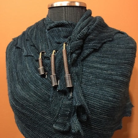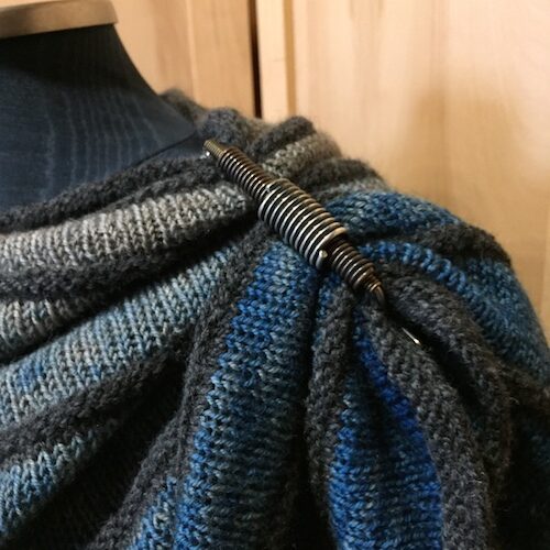 The sterling and brass coils move on the safety pin, and if you grab a really generous portion of knitted fabric, you can adjust where you would like the coils to sit once it is affixed to the garment. Shown on Across the Waters Cowl pattern knitted with Coriand3r Knits gradient fingering/3 ply merino yak nylon yarn and Classic Elite Yarns Adelaide, DK/Sport weight, in dark gray.
