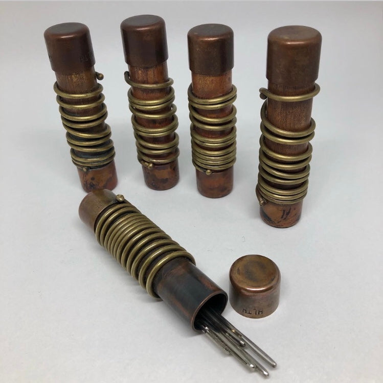 Copper tubing with brass wire detail. Sometimes I solve my own knitting problems! Didn't have a dedicated space to keep all my darning needles in, so I made this copper tube version with a brass wire wrapped detail. Each one is slightly different from each other depending on how the swirl of brass works out. So easy to find in the bottom of your project bag, you just have to feel around for it and there is no mistaking the feel and shape of it.