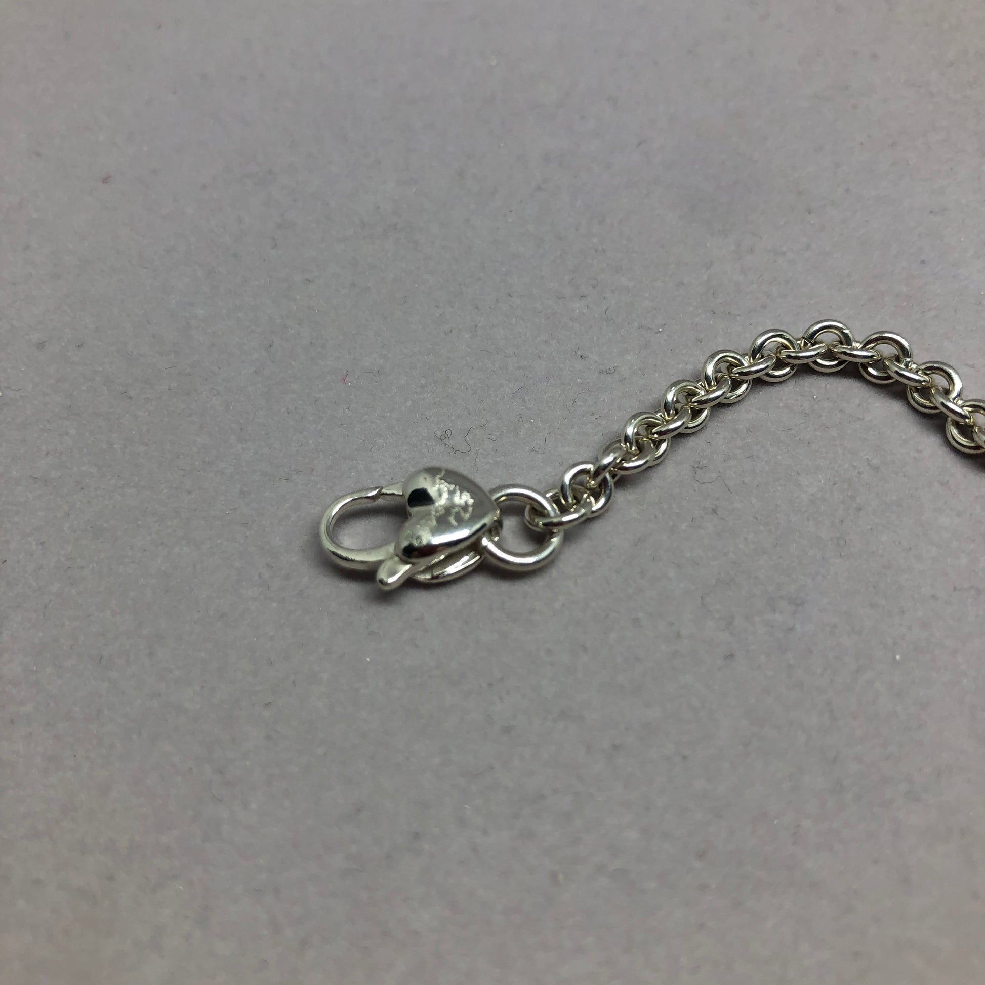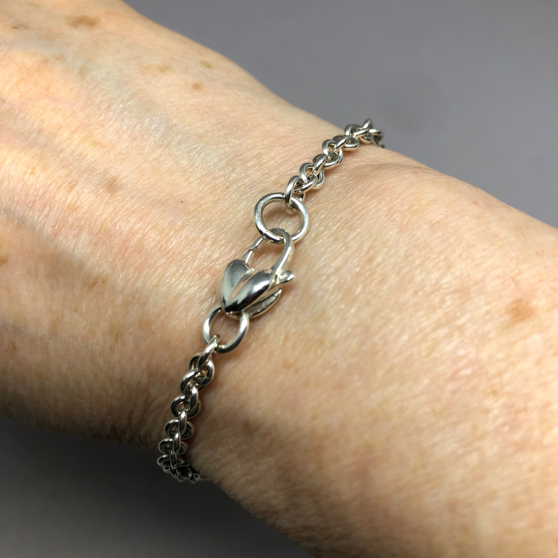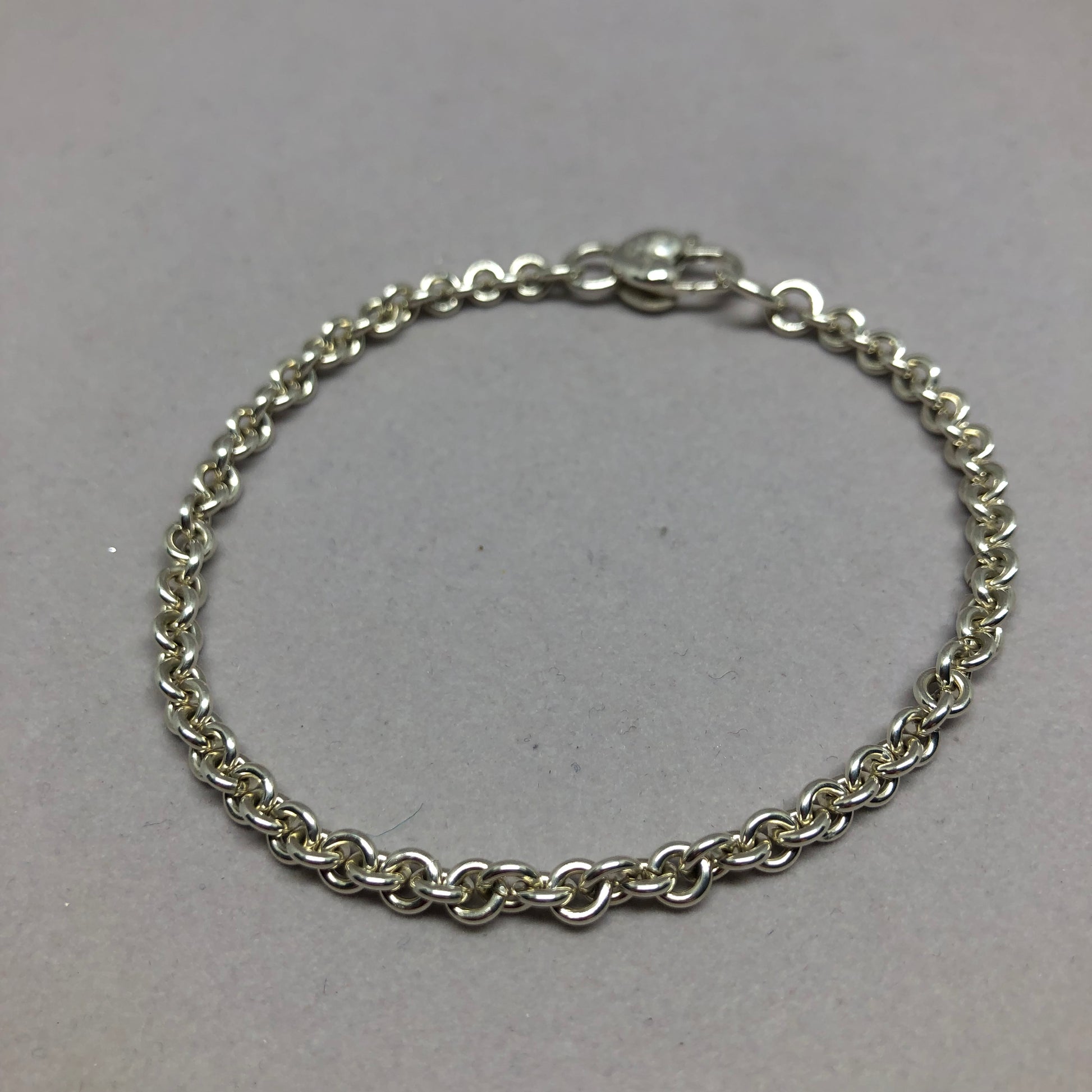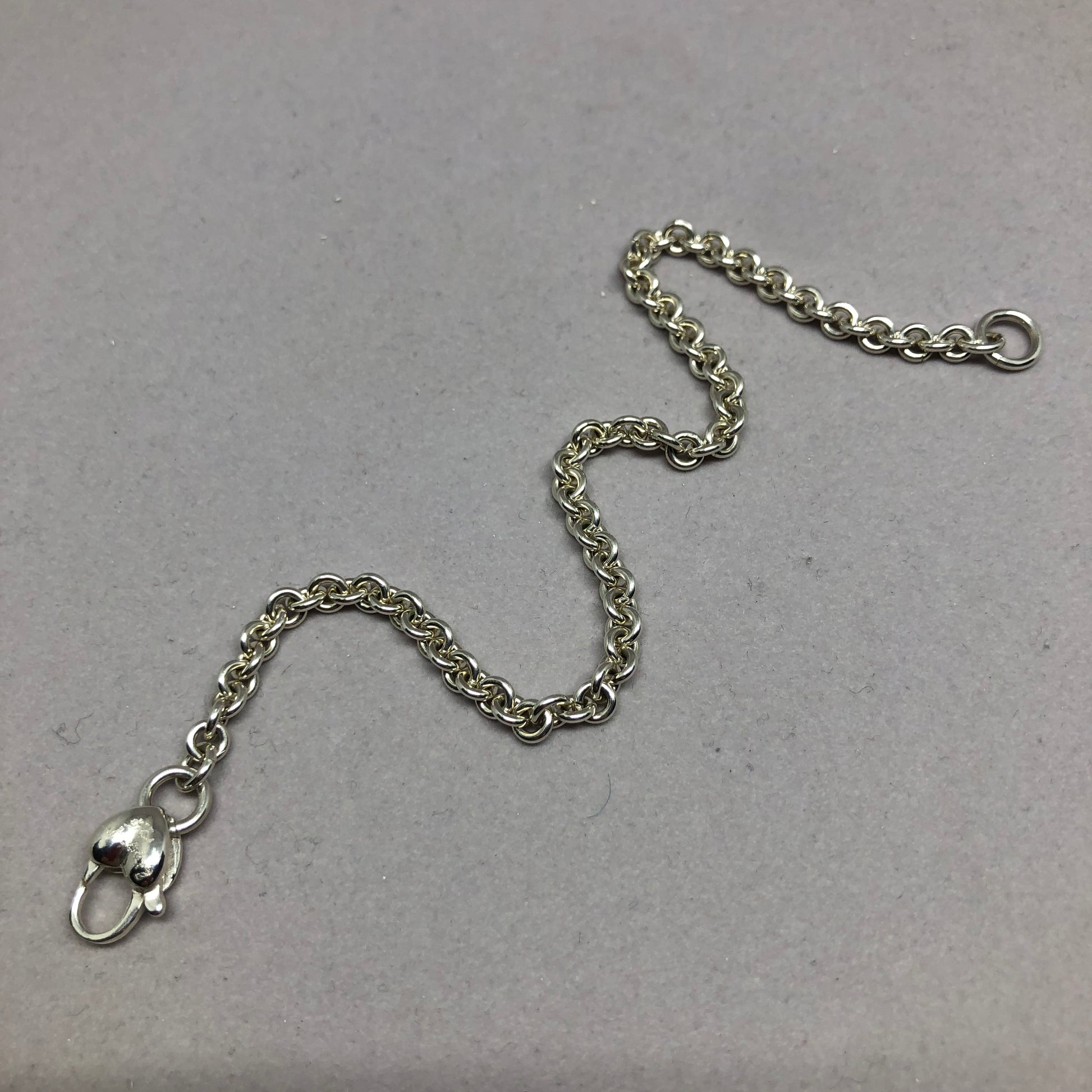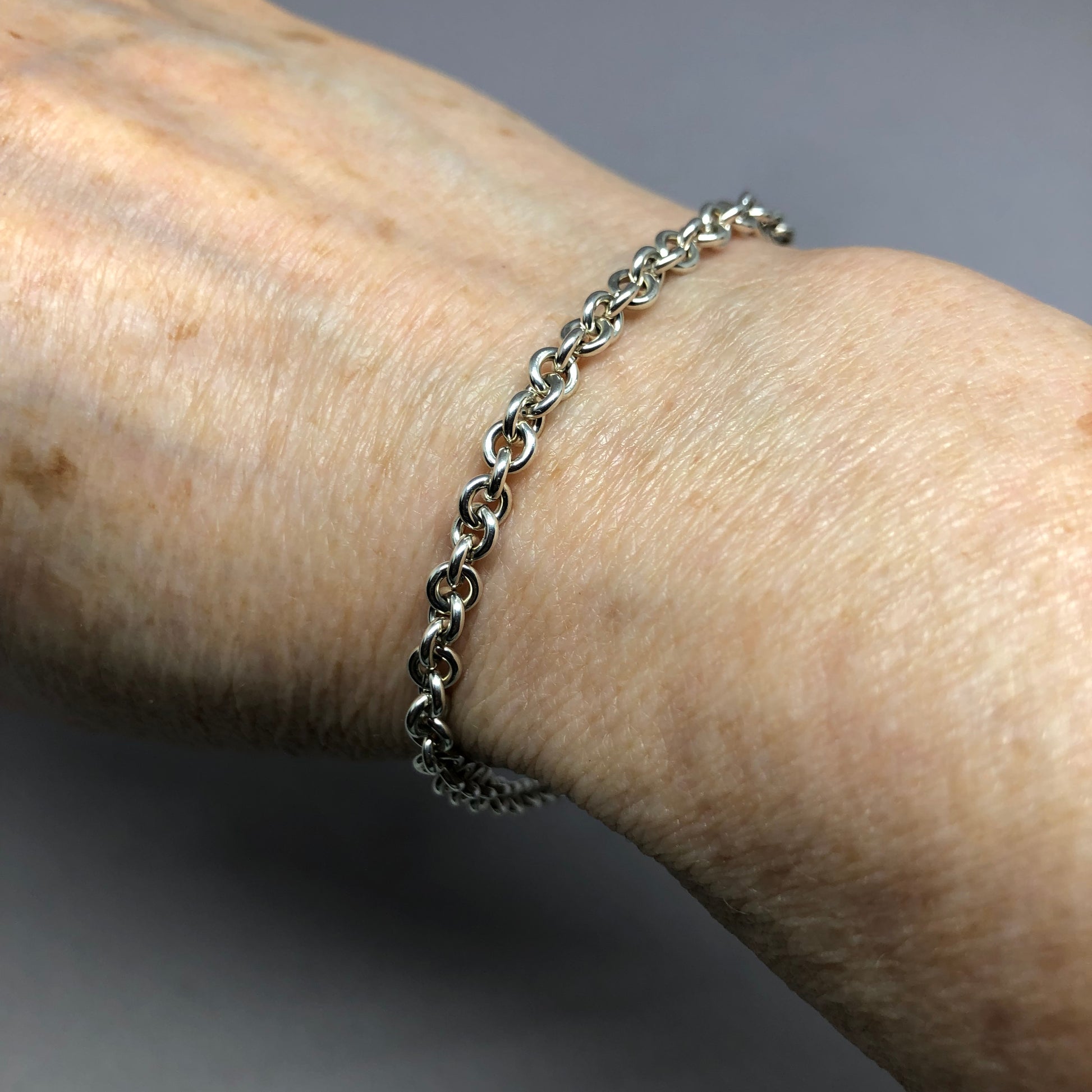 Sterling silver. Very simple, smallest of the chains I make, single chain bracelet. Great to stack with others. Comes in various length options. Exact match to the Eva Necklace.