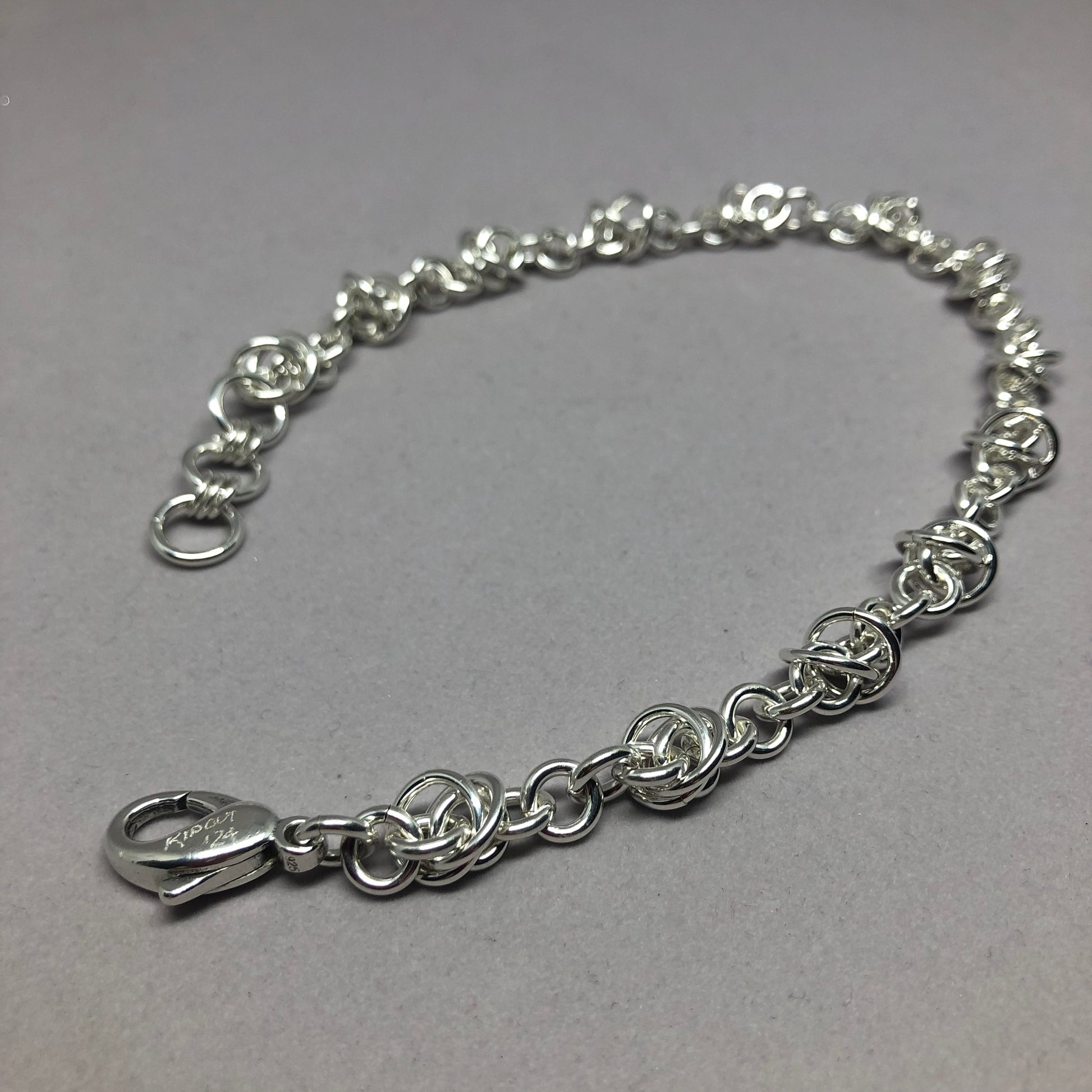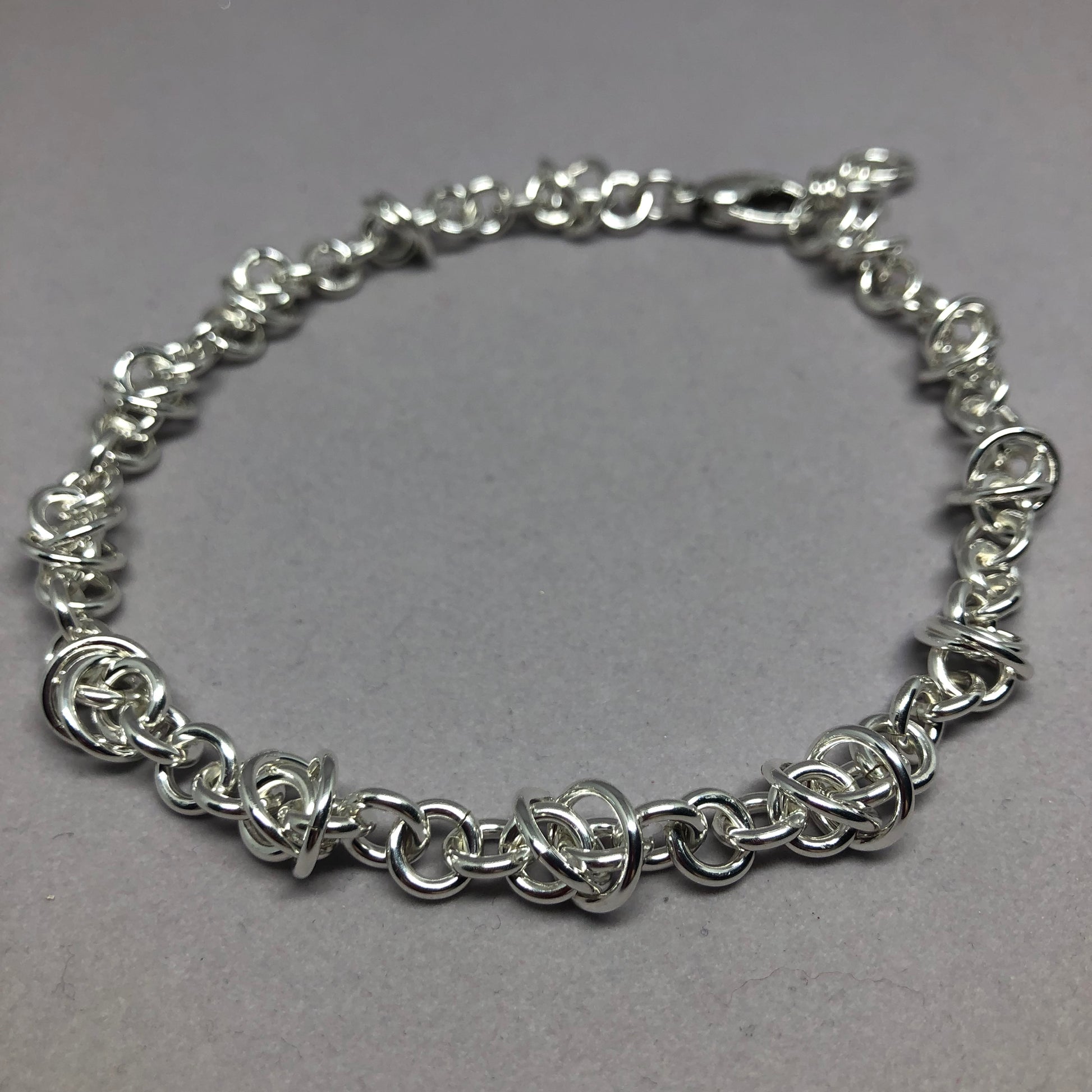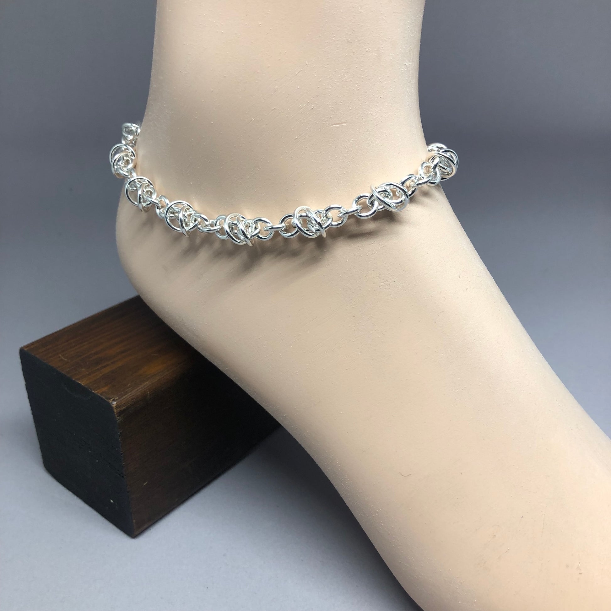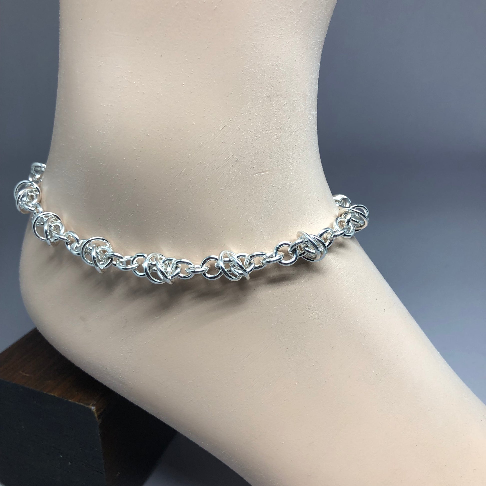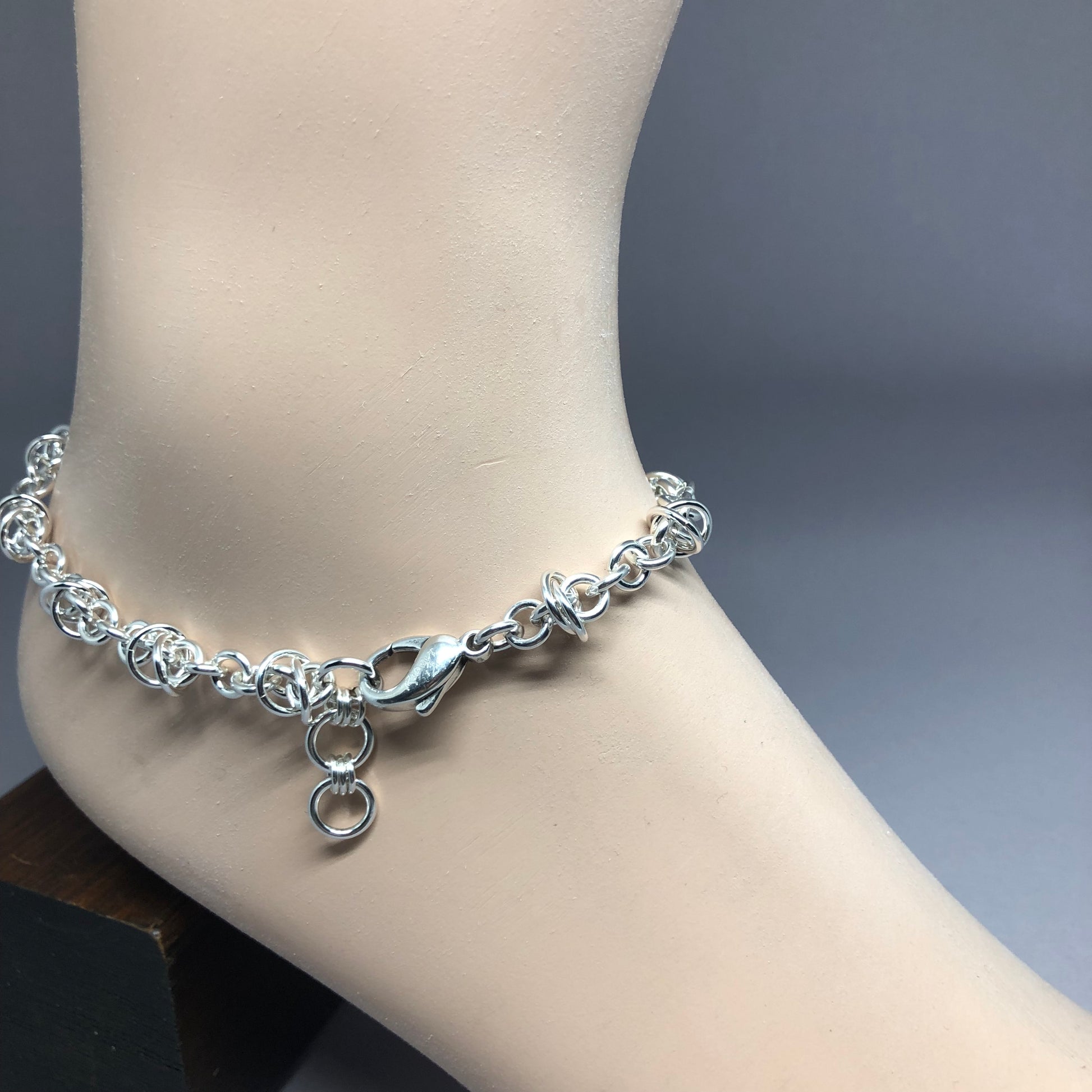 Anklet version of the Fiddle Styx Bracelet. Comes in three sizes, and each size has 3 different places to hook the clasp to, depending on where you want it to sit on your ankle. Small size is from 9"-10" (so 9.0", 9.5" and 10" options), Medium size is from 10"-11" (so 10.0", 10.5" and 11.0" options) and Large size is from 11"-12" (so 11.0", 11.5" and 12.0" options). I also use a large lobster claw clasp because I figured out that putting on an anklet is not the same as putting on a bracelet. It's a bit more difficult to accomplish, so decided to use a larger clasp to make the job easier.