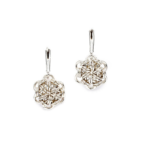 Sterling silver. Lisa's chainmaille reinterpretation of a flower head, smaller ring construction than the other matching pieces in this line. Available in french back and huggie styles only. French back version shown. Match to Flower Bracelet or Flower Watch, and Flower Pendant.