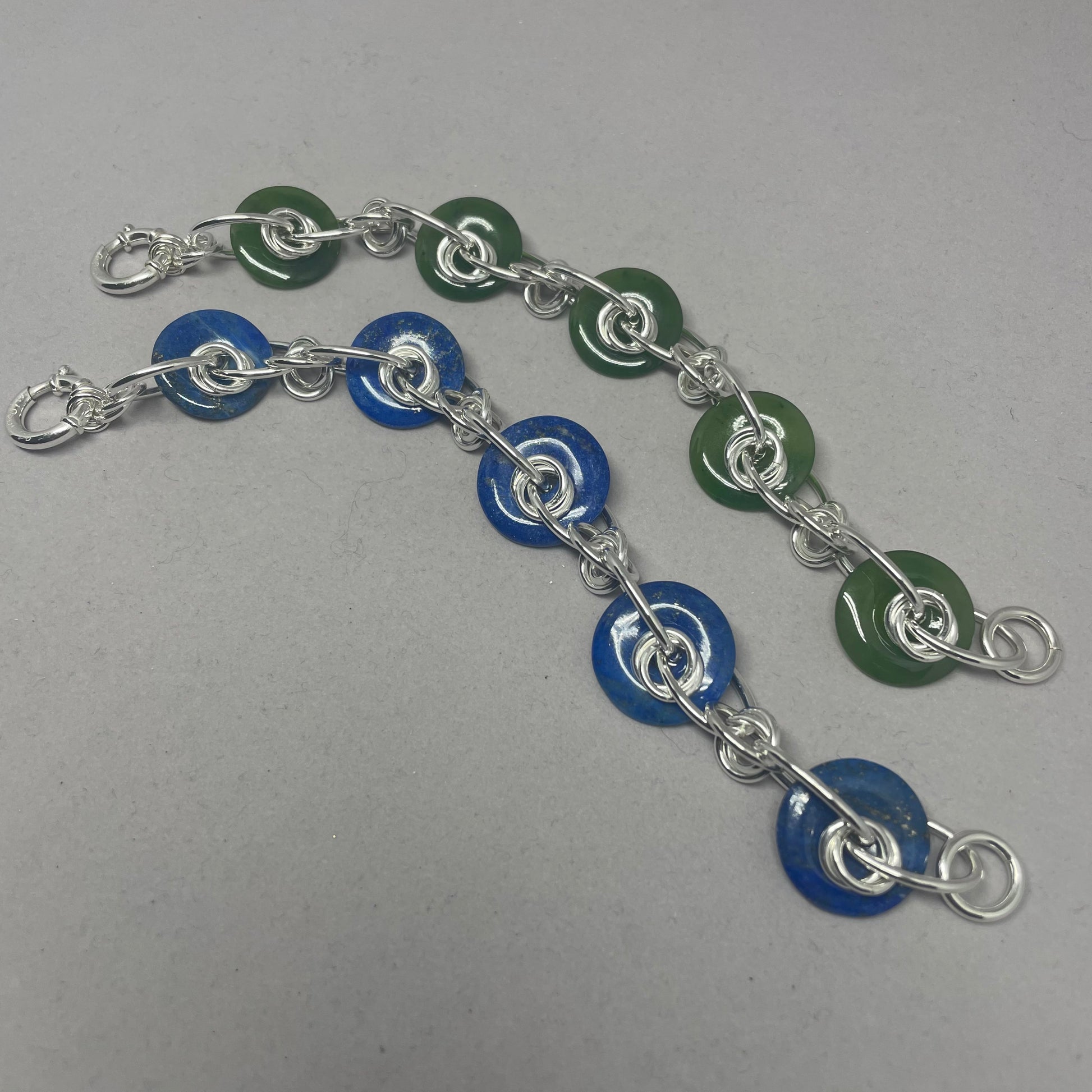 Using 20 mm round Lapis Lazuli (which is Arabic & Latin meaning blue stone) donuts, from Afghanistan, combined with sterling silver handmade oval and round links, Lisa has created this uniquely designed bracelet. Incorporating her signature twisted ring design and deluxe sterling spring ring closure, this bracelet is 8.50" long. It can be hooked in another ring besides the end ring to make it shorter. You will receive this exact bracelet when ordering and depending on your computer screen set up, the blueness of each stone may not be depicted exactly as in real life. Lapis Lazuli is composed of several minerals in addition to Lazurite (the mineral that creates the blue colour), which usually makes up 25-40%, but can be accompanied by augite, calcite, diopside, mica, sodalite and pyrite. The variation of these minerals can cause a wide range of colour placement and combinations. The presence of fine pyrite (which is also called "fools gold") is advantageous and is taken to shown genuineness. This bracelet design is also available in BC Nephrite Jade.