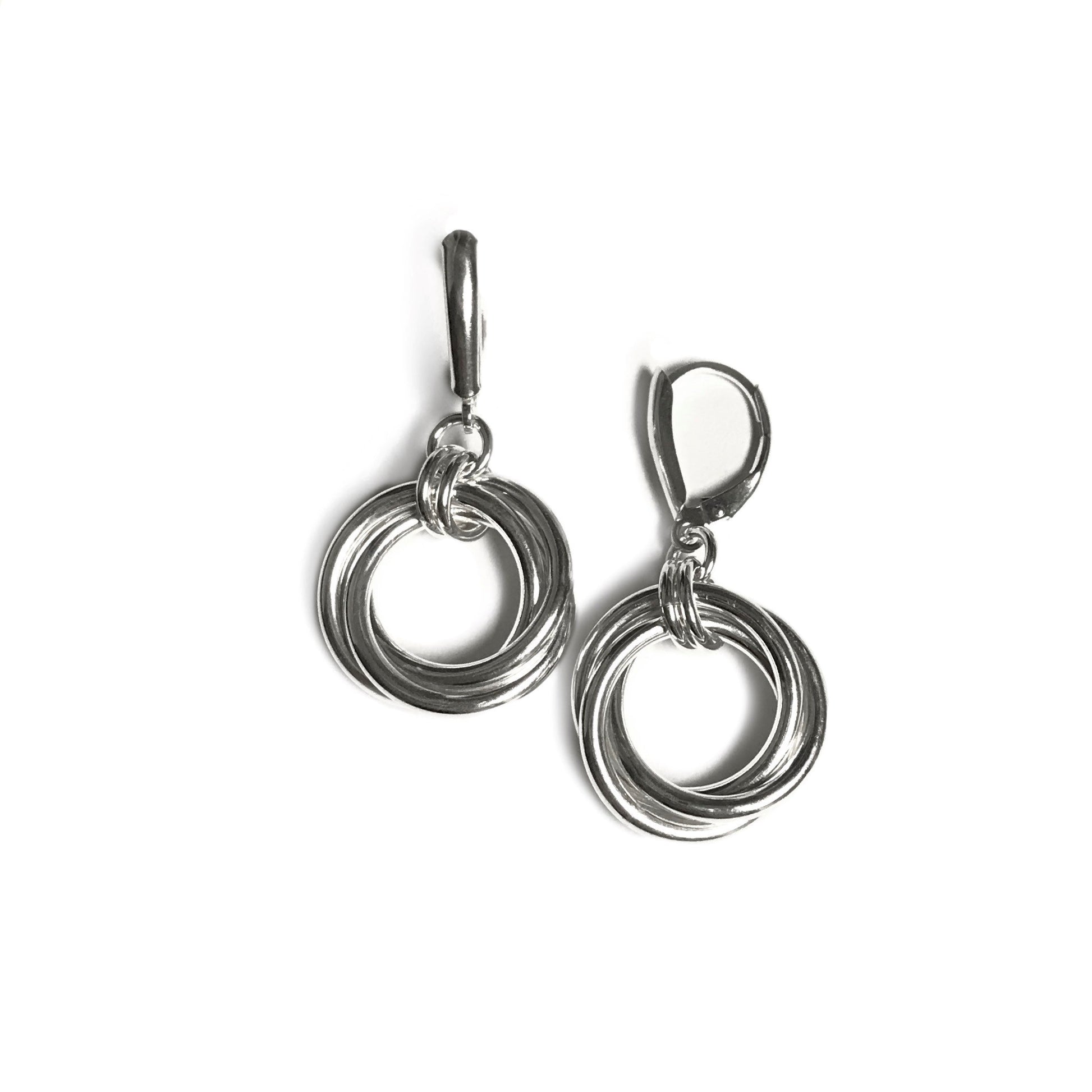 Sterling Silver. Classic, contemporary design. Will become one of your “go to” earrings in your earring rotation. Comes in Post, French Back and Huggies. French Back version shown. Big Sister to the Half Love Knot Earring Design. Same design, much larger rings. Exact match to the Large Love Knot Bracelet and Large Love Knot Pendant