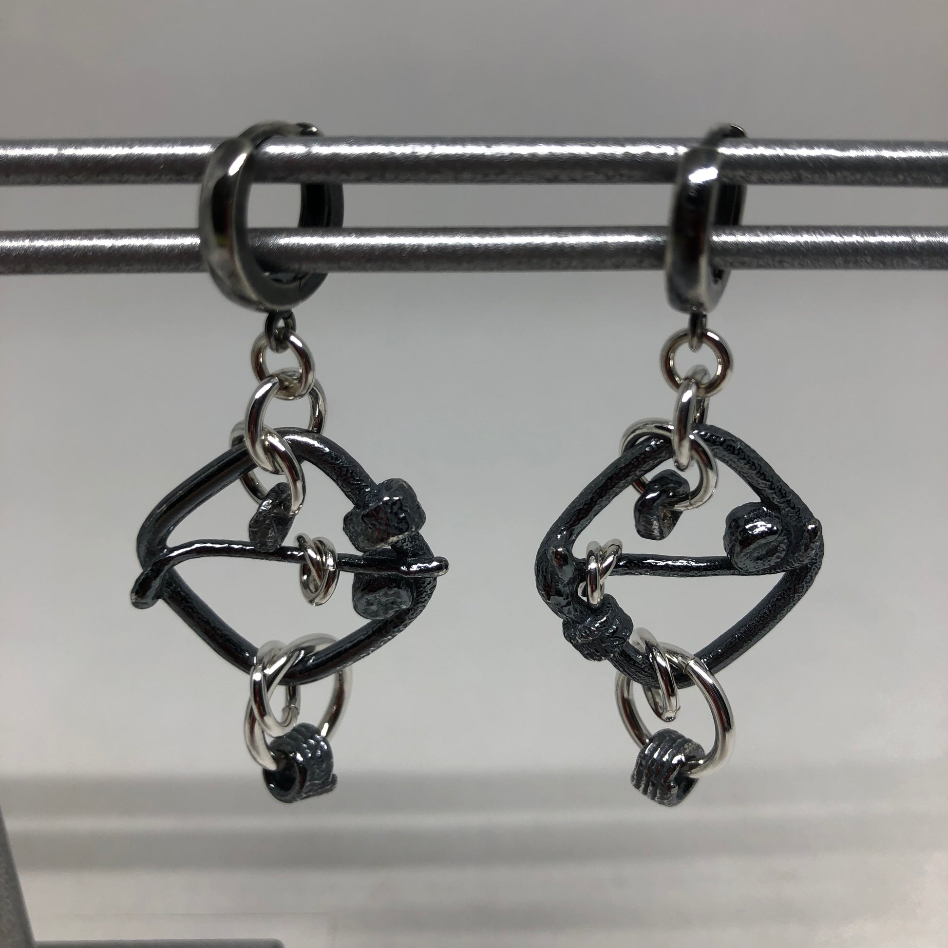 Sterling Silver & Oxidized Sterling Silver. Total length of 2.0". The Molten reference in the name of this design refers to how it is made. I create a lot of scrap when I make my own rings to build my chainmaille patterns. I decided to take the ends of the coils that don't get cut all the way through to become rings, and the rings that aren't quite whole, or round, or have some flaw or another in them and heat them up and slightly "melt" them to create beads or odd looking links. I then oxidize them to bring the melted texture out and combine those with my "perfectly round rings" to create this Molten series of work. Match to the Molten Bracelet and Molten Necklace.
