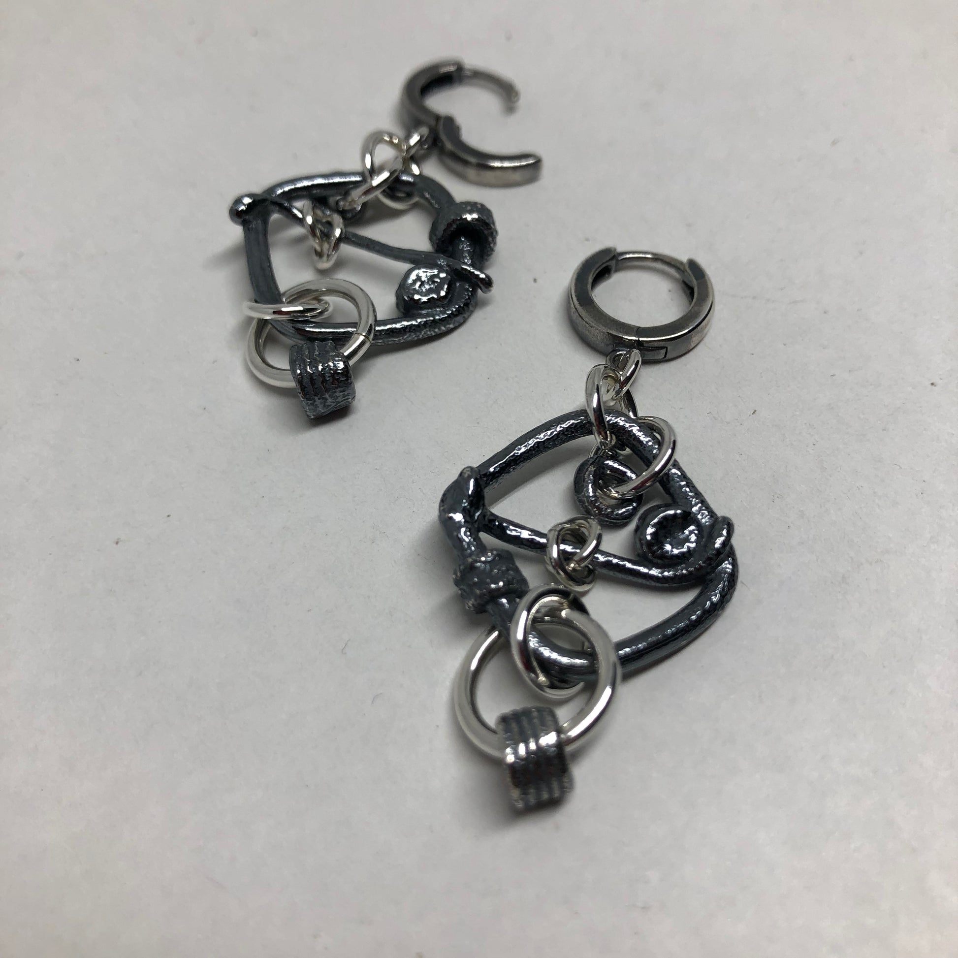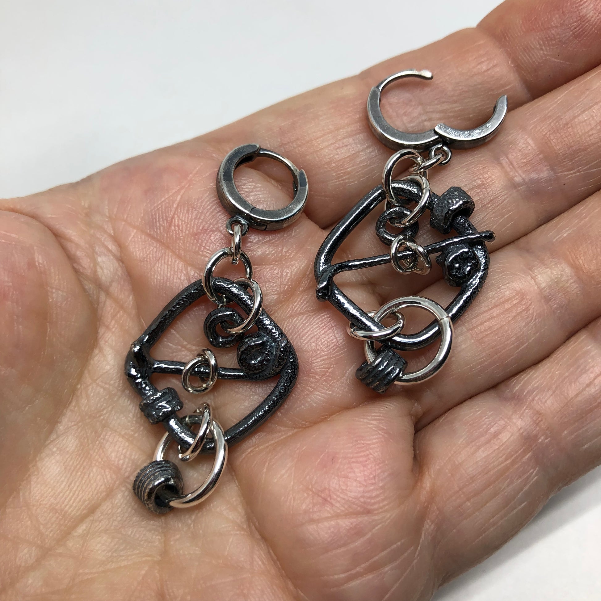 Each Molten piece is unique and the earrings on Huggies you see in the image is what this particular pair look like. You will receive this exact pair. Each pair is slightly different than the last, but the elements are very similar between each pair. Same approximate length, same approximate weight, etc. Each earring weighs approximately 6.0 grams. If you would prefer either a post and butterfly or huggie top instead, please state in the comment box when ordering. There will be no charge to change them over to the earring top of your choice. Very versatile and the combination of shiny and oxidized silver creates a look that easily goes from day to night effortlessly.