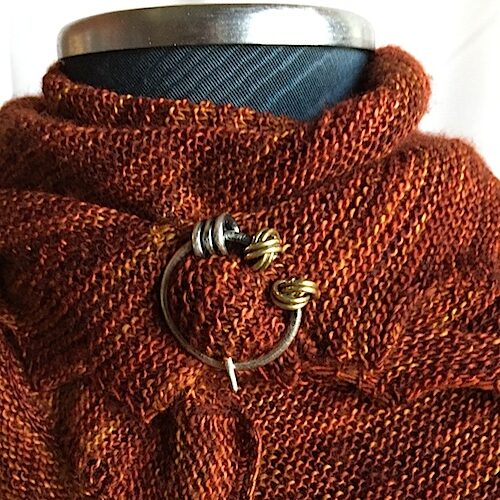 This pin can be used on all lace & fingering weight garments and is shown on a self-drafted shawl pattern using Manos del Uruguay‘s Marino yarn in Vesuvio