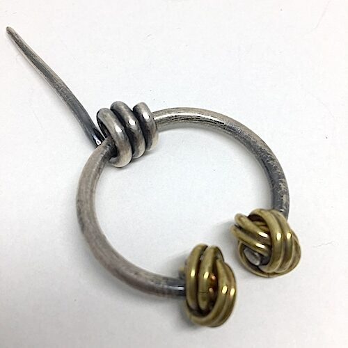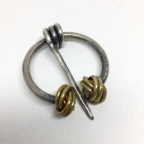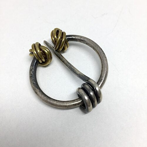 All penannular shawl pins are handmade one by one in Lisa’s studio. This particular one is hand wrought oxidized sterling silver with brass love knot twisted ring end pieces. Each pin is hand formed with individual brass jump rings made, then built in the love knot pattern and soldered on to the ends of the circular pin shape. Love Knot Shawl Pins are also made in oxidized sterling with either sterling, brass or copper Love Knot ends.