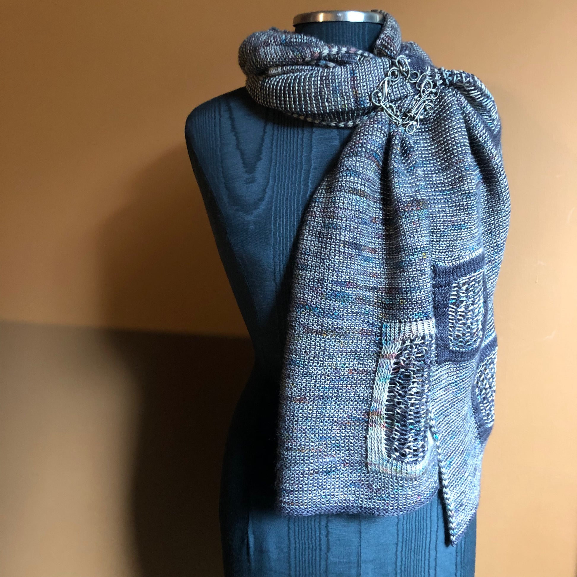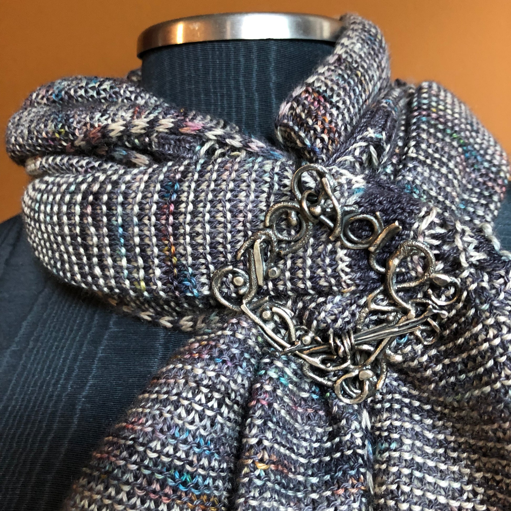 This design version is a combination of some of my "making rings scrap" bin, and ends of wire that had some type of flaw, so were unusable for making jewellery. This is a medium sized piece like Version 3. Dimensions are: Square frame is about 2" square, rubber connector is approximately 5.0" long and stretchable, and toggle is just over 2" long. Shawl/Scarf Cuff is shown on my Skyscraper Scarf I knitted with two contrasting skeins of Julie Asselin's Merletto yarn in Pixelated and Midnight Oil.