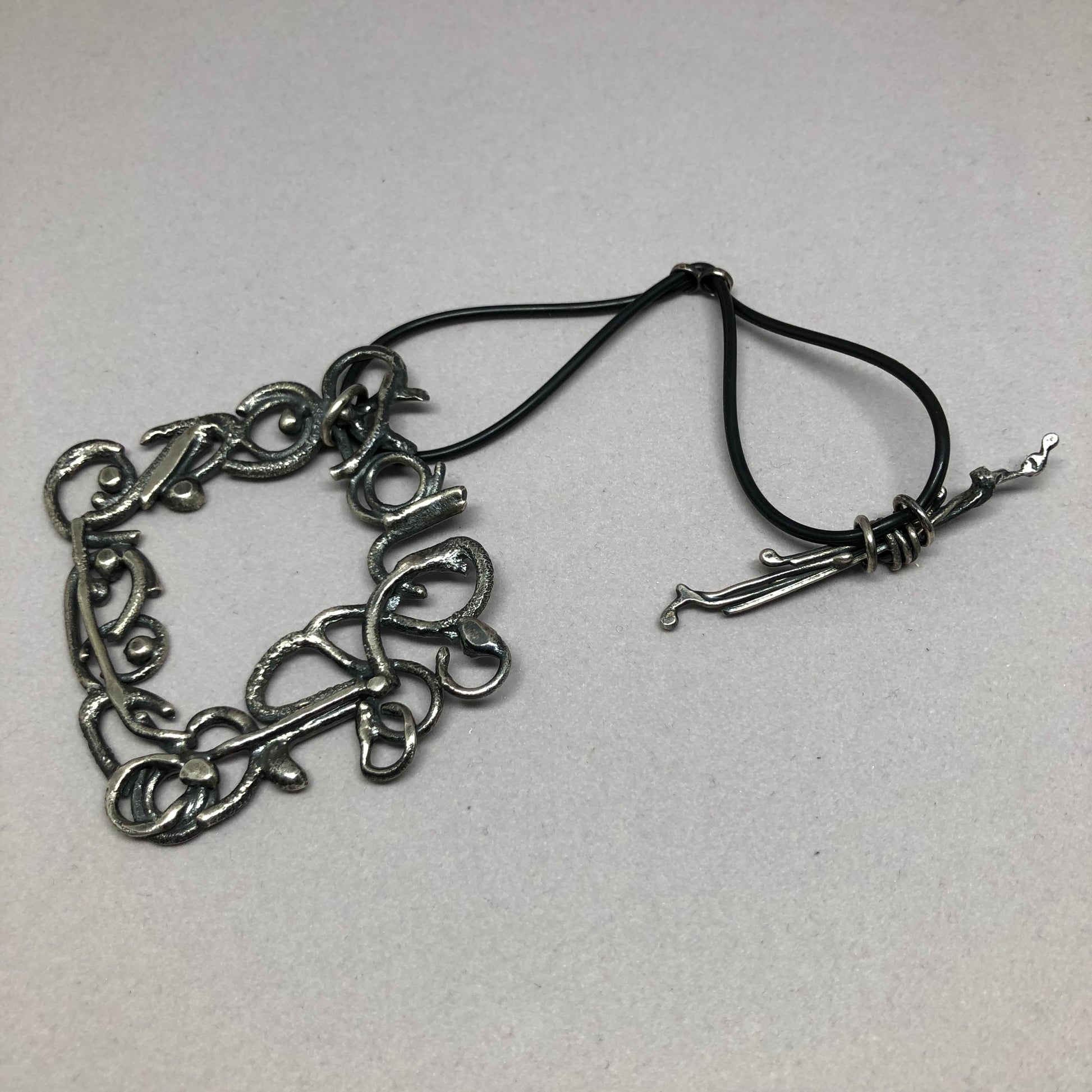 Using sterling silver scrap from making my chainmaille jewellery, each shawl/scarf cuff is a unique design based on the wire scrap remnants I piece together. Built like an oversized toggle with a black rubber, slightly stretchy connector, that allows the wearer to use with many different weights of scarves and shawls. This "cuff" design allows you to add it to your favourite knitted/crocheted or woven design without "piercing" the material. You just gather the fibre garment the way you would like it to sit around your neck and put the cuff all around the fibre material and slip the toggle portion through the centre of the cuff's squarish design.