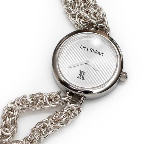 Sterling silver band and stainless steel watch head. Comes in silver, gold or sapphire blue watch face colours. One size fit’s most wrists, choice of where to place catch. Fits wrists from 7.0″ – 8.5″. Watch head comes with 3 year guarantee card from date of purchase, excluding battery replacement. Stainless steel case, sapphire crystal, 100 ATM, swiss movement, real 1.0 pt diamond at 12 position, with “R” logo on crown. Match to the Small King's Link Necklace & Small King's Link Bracelet.