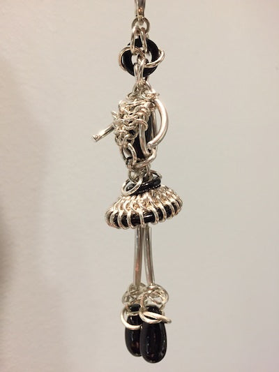 Sterling silver and Black Onyx. Designed and created in 2019 for the Winter One of a Kind Show. Made with black onyx beads of various shapes & sizes and imagined by Lisa into a large, statement pendant. Measures 5.5" L x 1.25" D (arms and skirt diameter). This piece moves as you wear it, and it appears as if the figure is dancing. All body parts (arms, legs, head, feet) move independently and gives this piece a very animated quality. Has a large sterling clip on the top, so it is easily clipped onto a necklace. There is only one and this is it.