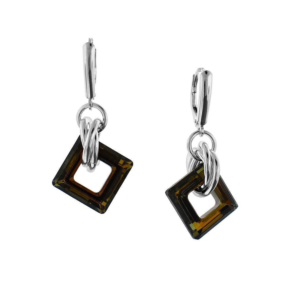 Sterling silver and Swarovski crystal. Add a little bit of sparkly interest to your day. These earrings use a 14 mm square frame crystal shape in combination with sterling silver handmade rings and earring tops. Choose from post & butterfly, french back or huggie tops. Shown in the Champagne colour with the post & butterfly tops and in Bronze with the french backs. Crystals come in various colours and are sure to become a favourite, doesn’t matter what colour you choose! Exact match to the Wow Squared Bracelet and Wow Squared Small Pendant. Also pairs well with the Wow Squared Medium Pendant or Wow Squared Large Pendant.