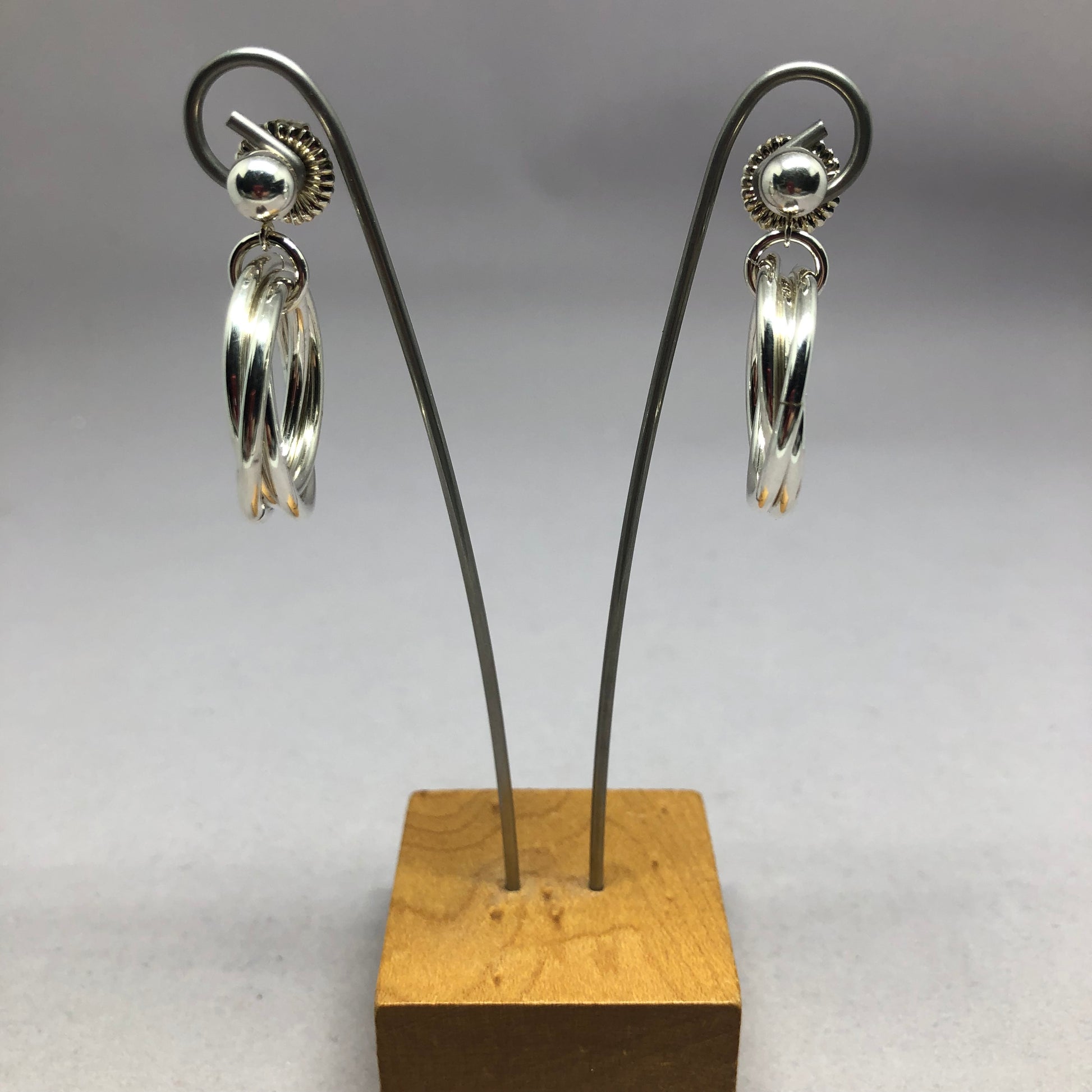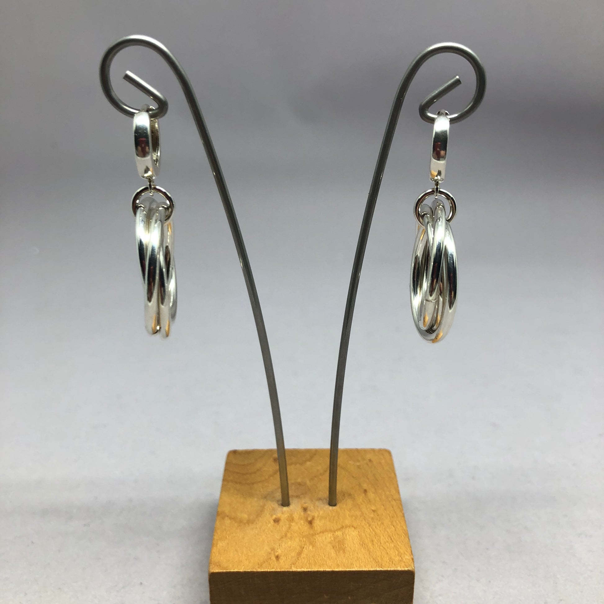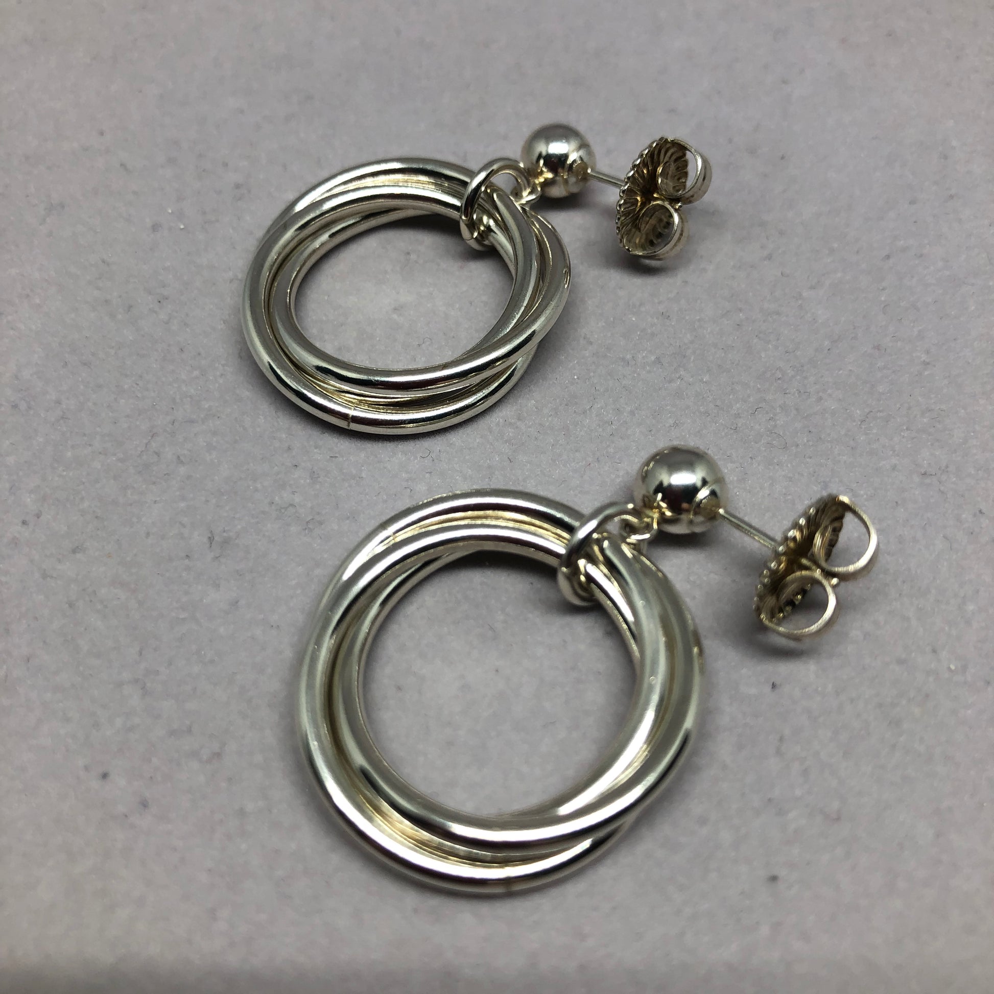 Sterling silver. Largest of the Love Knot series of earrings. These ones I decided to make them the opposite direction of the large Love Knot version. These are more like "hoops" because of the direction they hang, parallel to your head, not perpendicular. Available in Post, French Back and Huggies. The Post version is the shortest, coming in at about 1.25" long, French back is the longest, just over 1.5" and the huggie version is just 1.5" long. Each earring weighs approximately 7.3 grams each.